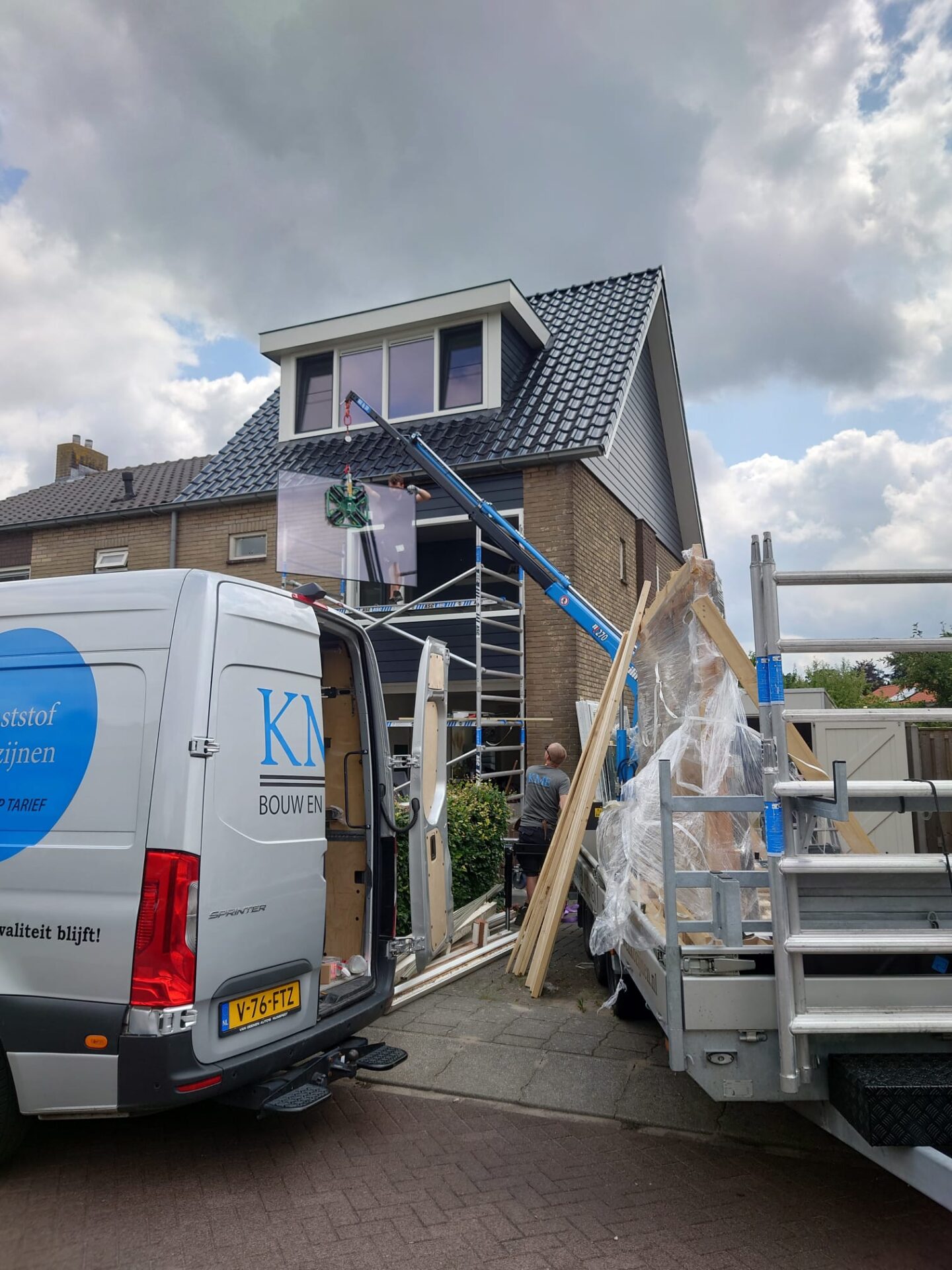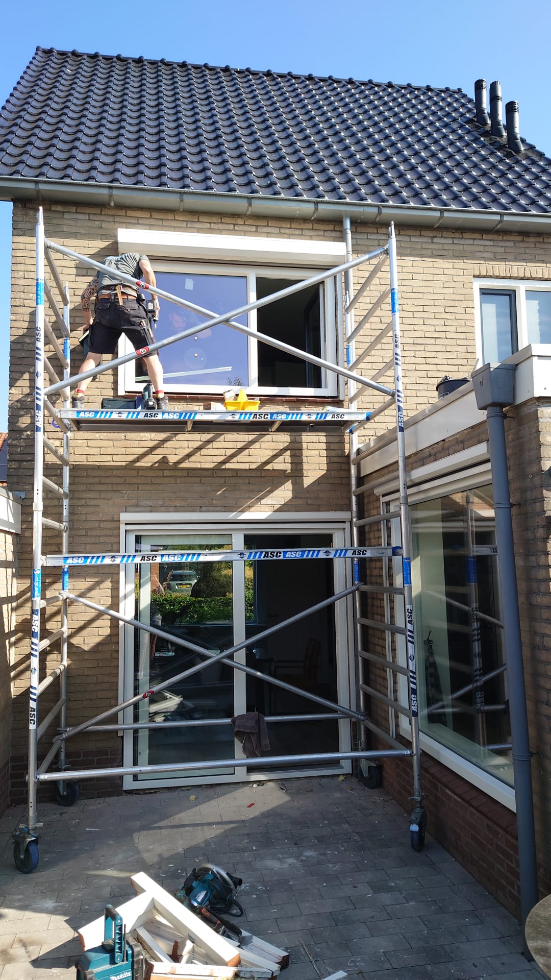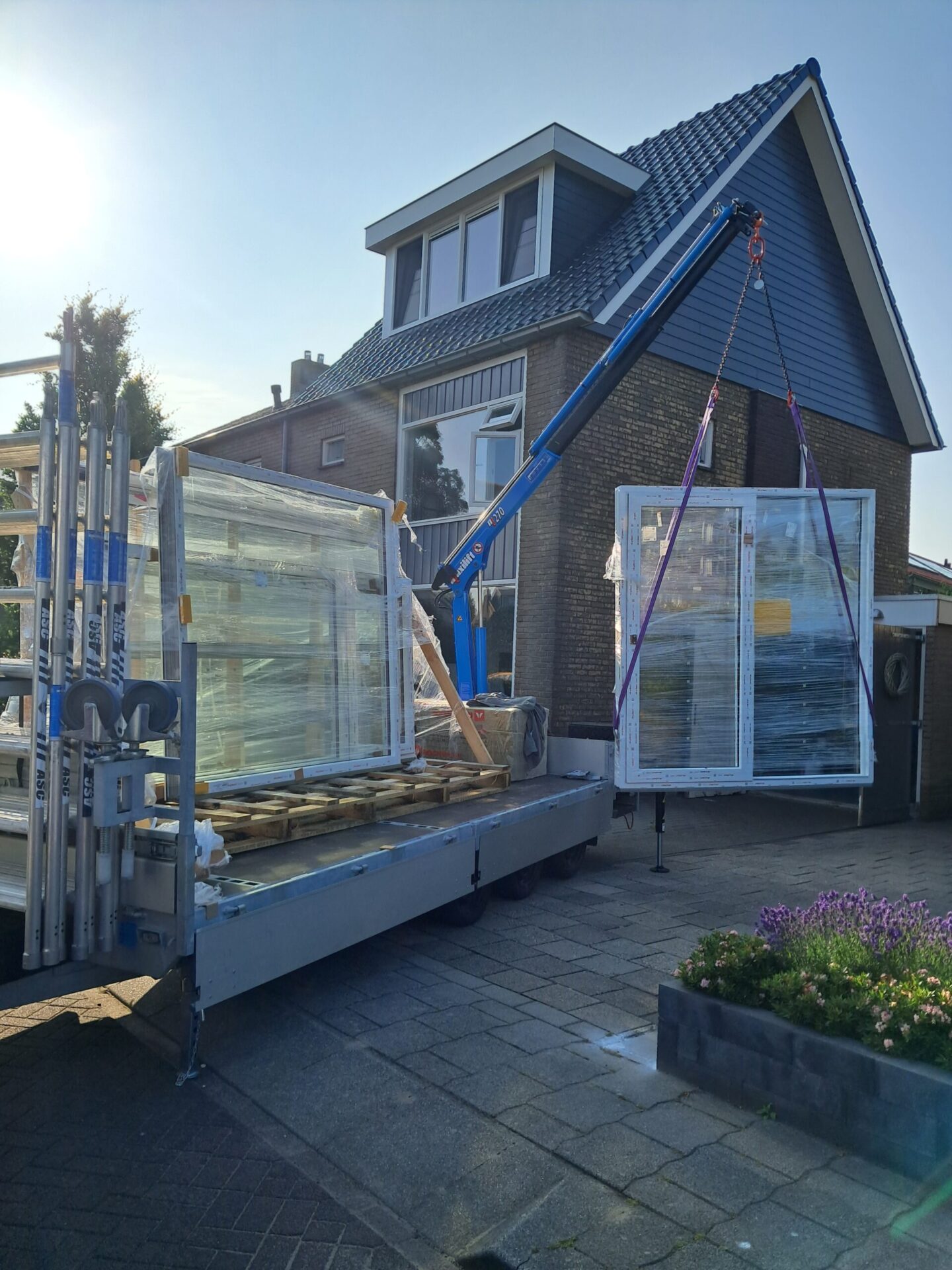 Om de kozijnen op de bovenverdieping te kunnen vervangen wordt er gebruik gemaakt van een steiger. De kozijnen en het glas worden naar boven getakeld met de kraan. Dit is voor de werkmannen een ergonomische manier van werken en het geeft minder kans op beschadigingen aan het materiaal.