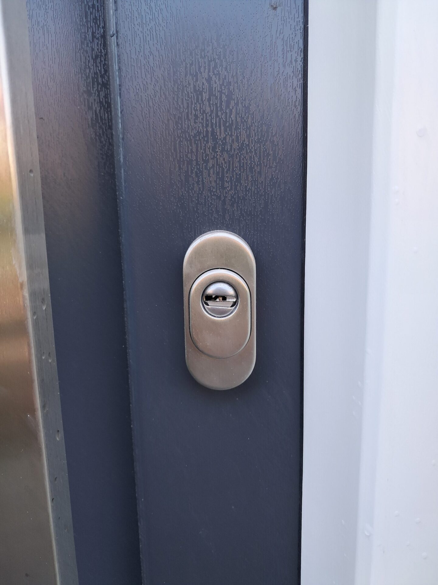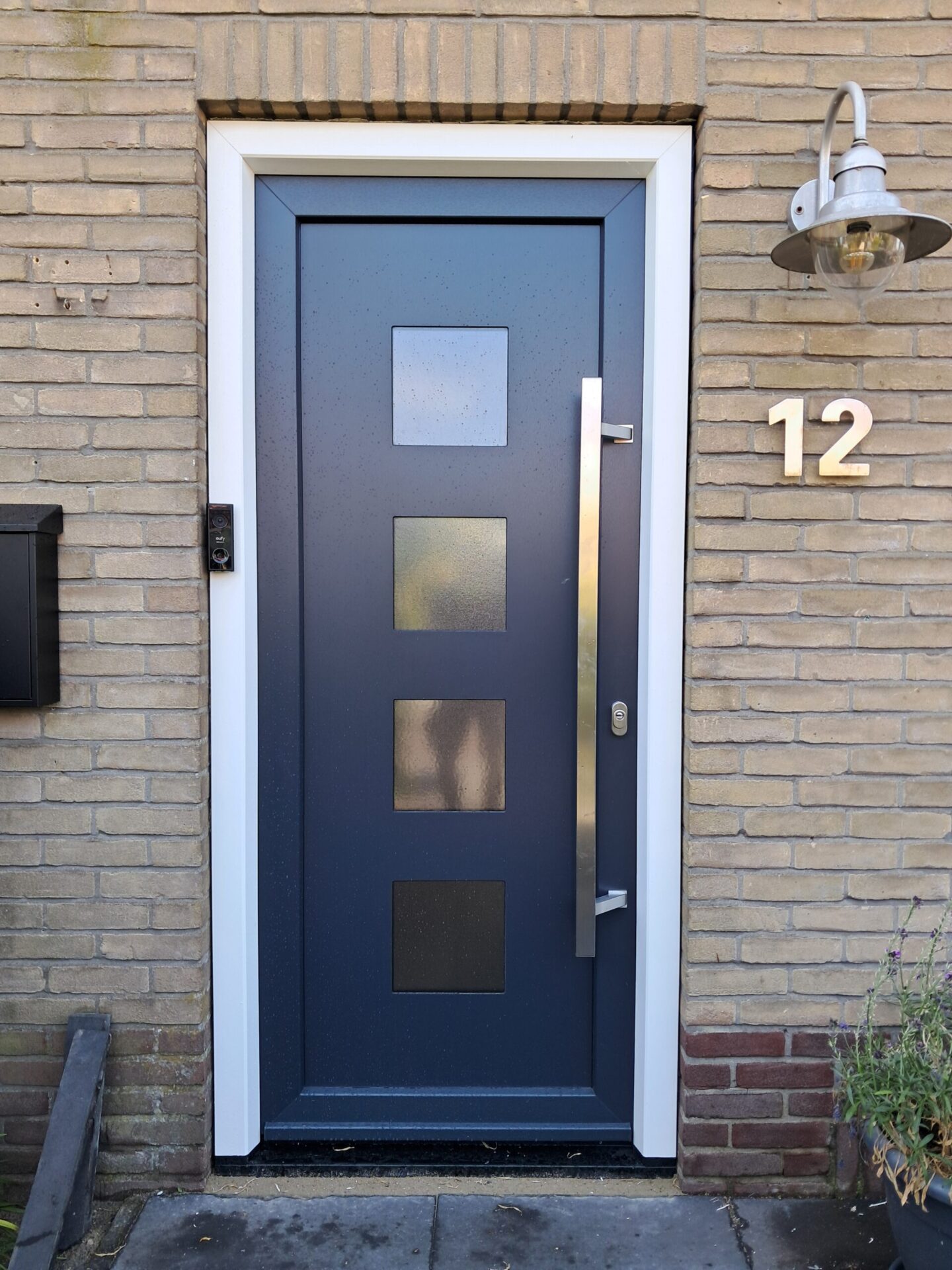 Deze klant heeft gekozen voor een stijlvolle deurklink en de ruitjes zijn voorzien van crepi glas, zodat directe inkijk niet mogelijk is.
